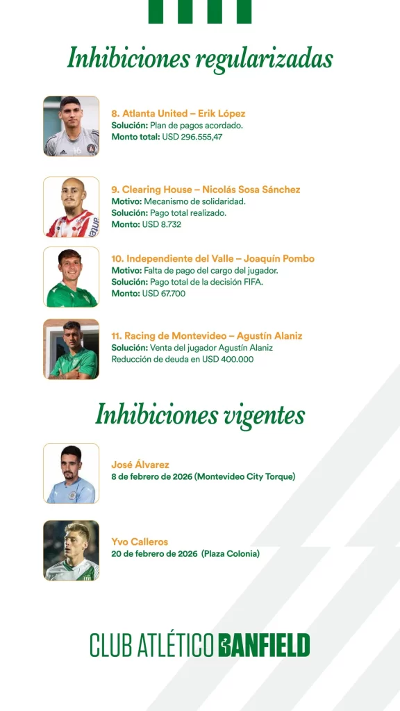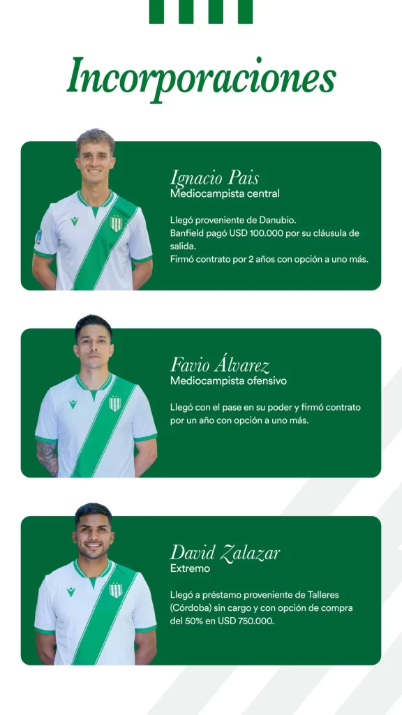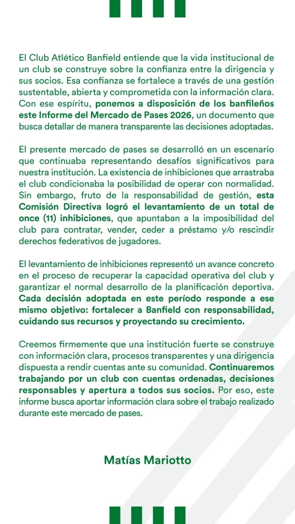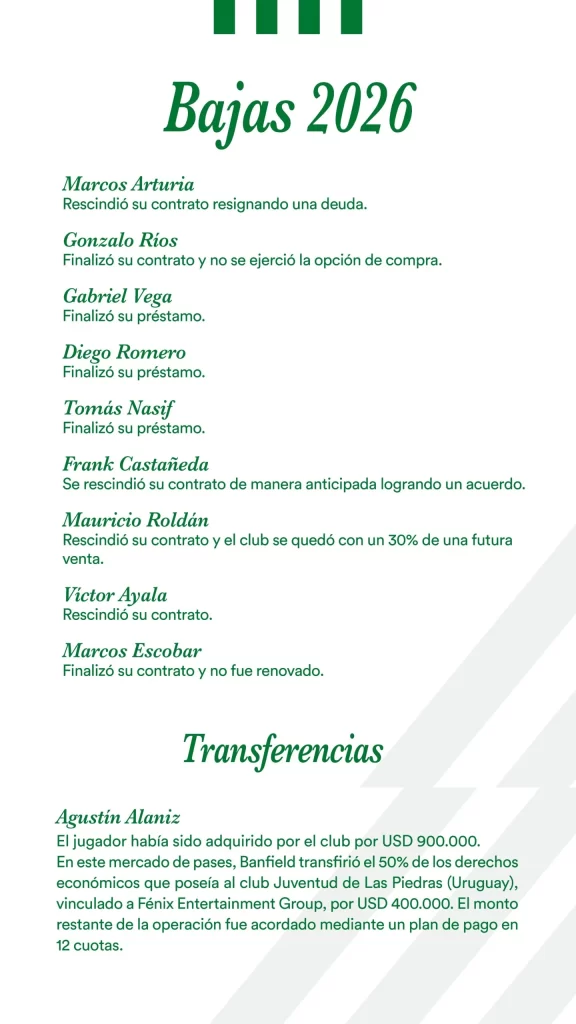 Concluido el mercado de pases 2026, el Club Atlético Banfield presenta a sus socios, socias e hinchas el Informe del Mercado de Pases, en el que se detallan las altas, bajas, transferencias y demás novedades vinculadas al plantel profesional de fútbol masculino.