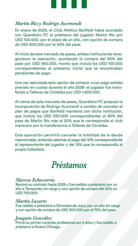 En línea con el compromiso asumido por esta gestión de sostener una comunicación abierta y transparente, el club comparte nuevamente con su comunidad el detalle de cada una de las operaciones realizadas durante este período.